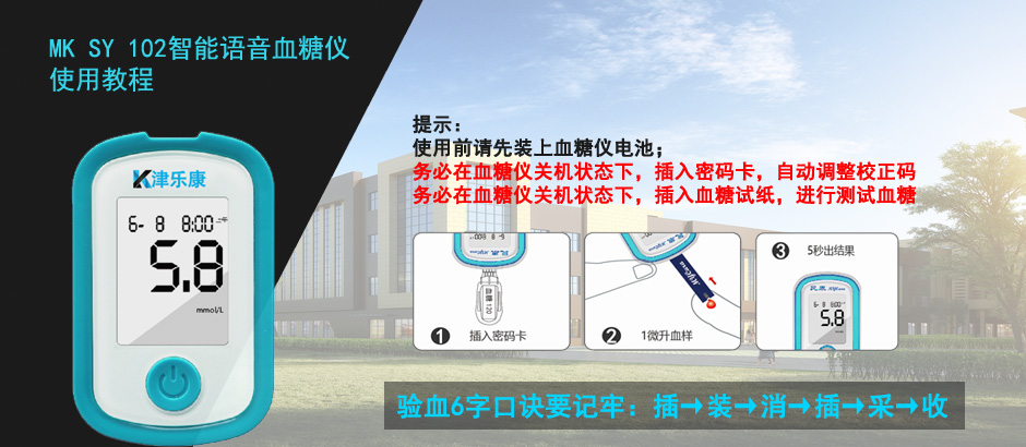 民康MK SY102智能語音血糖儀使用教程,提示: 使用前請先裝上血糖儀電池; 務必在血糖儀關機狀態下,插入密碼卡,自動調整校正碼 務必在血糖儀關機狀態下,插入血糖試紙,進行測試血糖